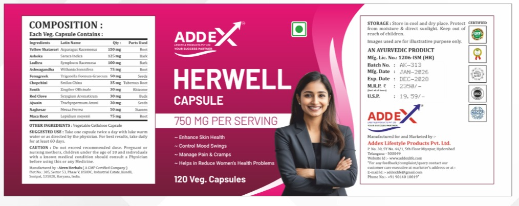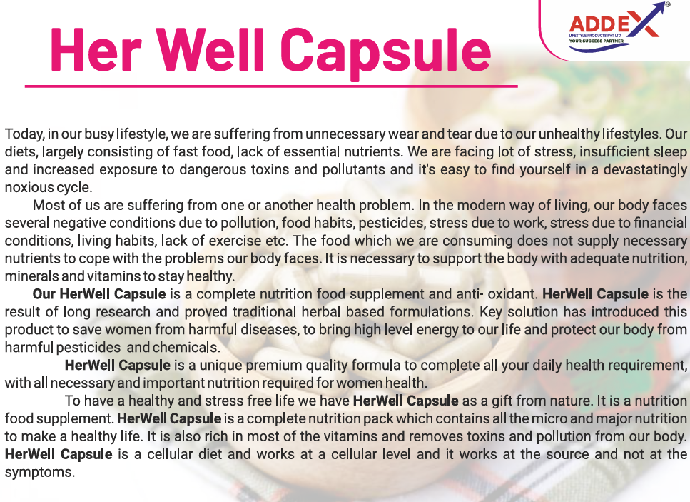 HerWell Capsule is a complete nutritional food supplement and antioxidant. HerWell Capsule is the result of long research and proved traditional herbal based formulations. It is a complete nutrition pack which contains all the micro and macro nutrients to make a healthy life. It is also rich in most of the vitamins and removes toxins and pollution from our body. HerWell Capsule is a cellular diet and works at a cellular level and it works at the source and not at the symptoms.