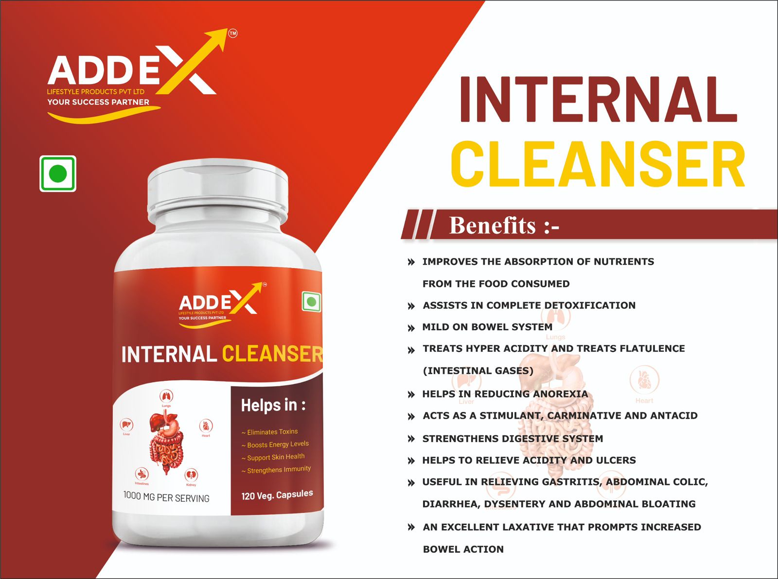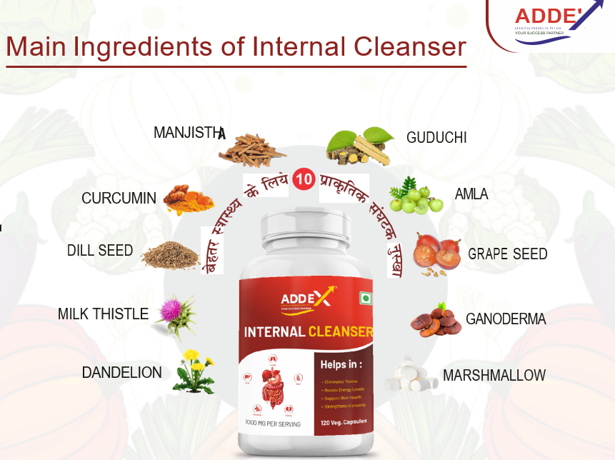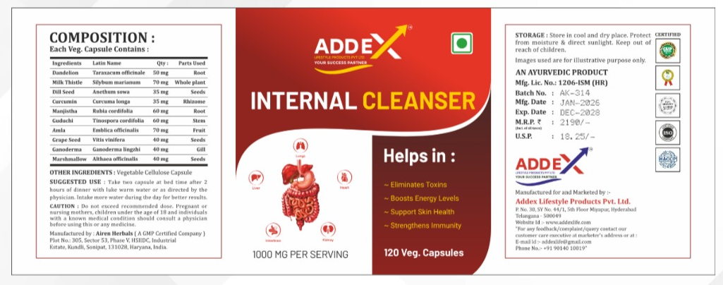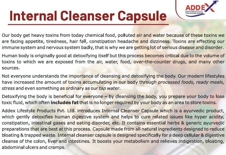 Internal Cleanser Capsule which is a ayurvedic product, which gently detoxifies human digestive system and helps to cure related issues like hyper acidity, constipation, intestinal gases and eating disorder, etc. It contains essential herbs & generic ayurvedic preparations that are best at this process. Capsule made from all natural ingredients designed to reduce bloating & trapped waste. Internal cleanser capsule is designed specifically for a deep cellular & digestive cleanse of the colon, liver and intestines. It boosts your metabolism and relieves indigestion, bloating, abdominal ulcers and cramps.